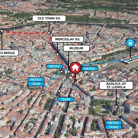 A Prágai Állami Operaház 500 méterre, a Szent Ludmilla-templom pedig egy 450 méteres távolságra van az apartmantól. Az apartman Prága Vinohrady körzetében fekszik. A Petřín-kilátó nagyjából 25 percnyi sétára található az ingatlantól.